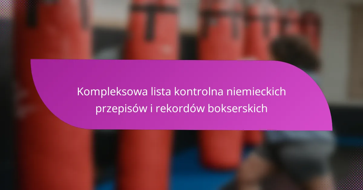 Ta kompleksowa lista kontrolna przedstawia kluczowe regulacje i zapisy dotyczące boksu w Niemczech, ustalone przez Niemiecką Federację Boksu (BDB). Zawiera istotne aspekty, takie jak licencjonowanie, standardy medyczne i protokoły bezpieczeństwa, a także szczegóły dotyczące utrzymywania zapisów bokserskich, aby zapewnić przejrzystość i dokładność w śledzeniu wyników zawodników.
